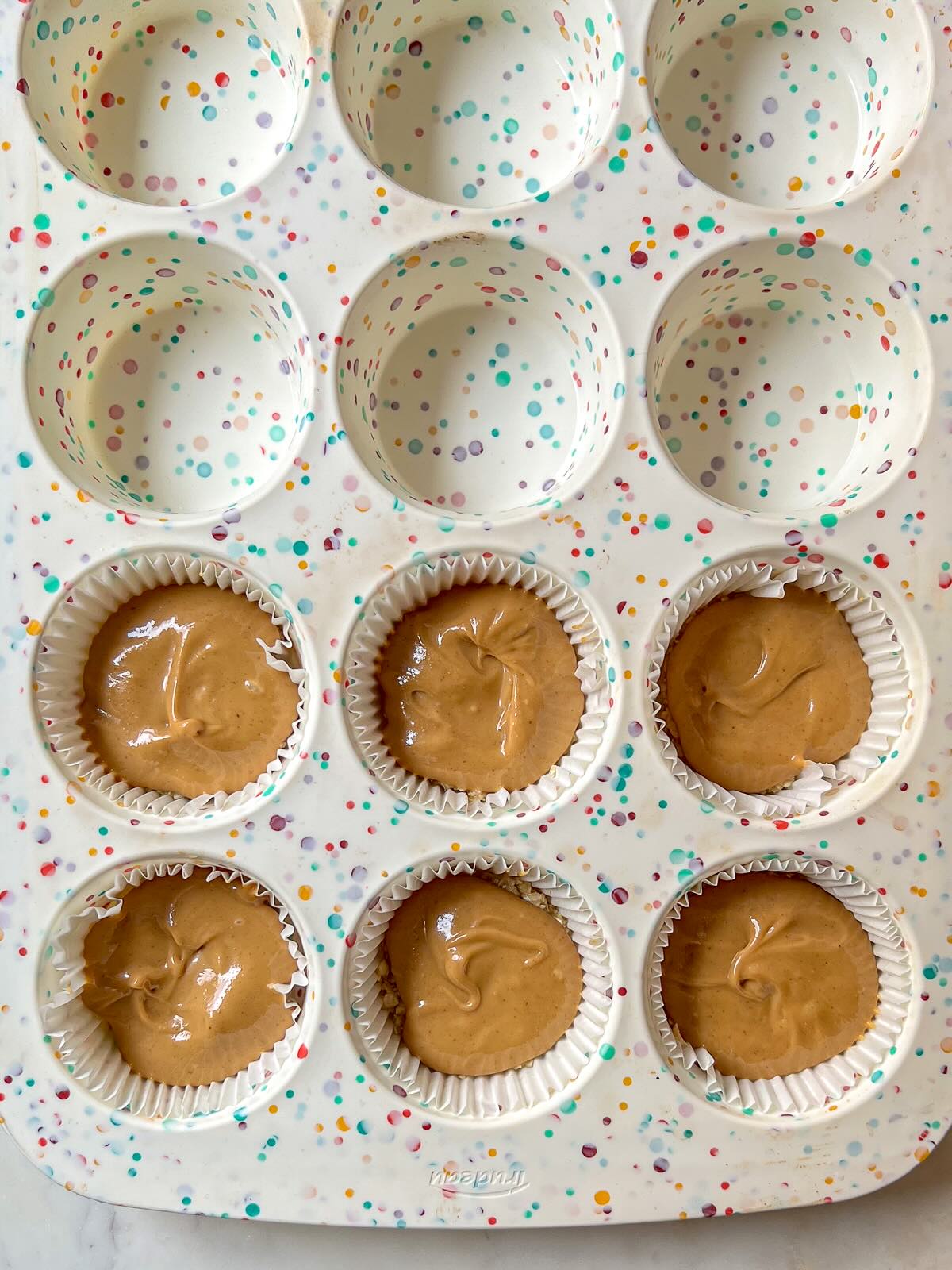 - Assemble the cups: Divide the dough evenly into six muffin cups (use a silicone muffin tray or line with paper muffin liners for easy removal). Press the dough firmly into the bottom of each cup to form a solid base.